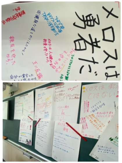 2年生の国語の授業では、「走れメロス」の学習を行っています。「メロスは勇者か、勇者でないか」を本文の表現から考えさせて、意見交流を行いました。「人質を差し出すなんて、勇者じゃない!」「たくさんの困難を乗り越えて、戻ってこられたから勇者だ!」等さまざまな意見が出ました。最後に、振り返りプリントでまとめています。