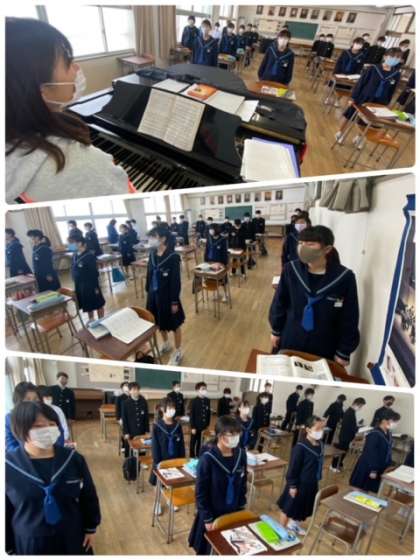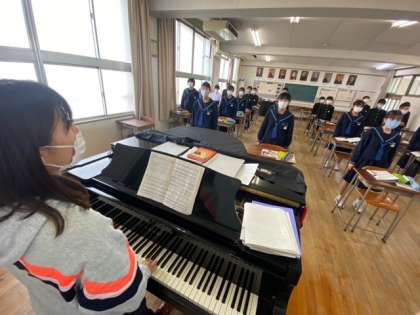 1年生の音楽の授業では、合唱を行っています。新型コロナウイルス感染症対策として、集まっての合唱はできませんが、マスクの中で歌っています。