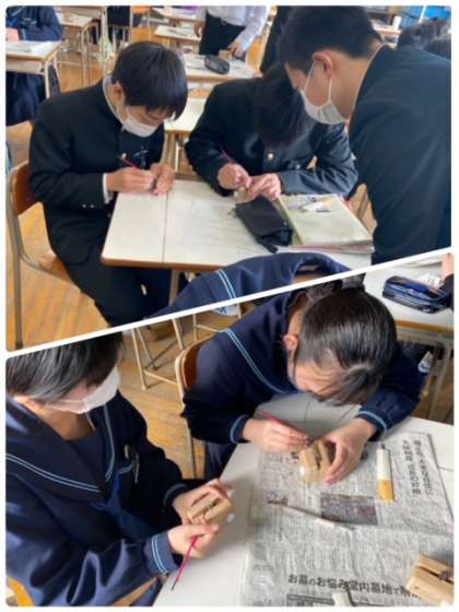 3年生の美術の授業では、篆刻を行っています。篆刻とは、印章を作成するもので、自分の名前を篆書体にしたり、図形を象ったりしています。世界にたったひとつの作品を完成させていきます。