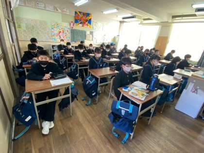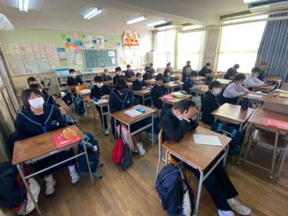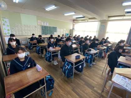 1年生の放送全校集会を聞いている様子です。朝一番のため、若干眠たそうな生徒たちもいますが、校長先生のお話をしっかり聞いています。