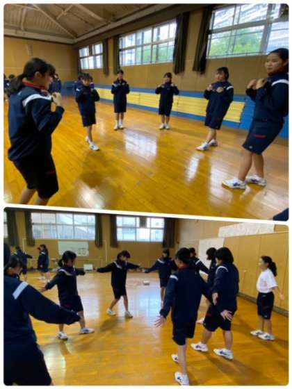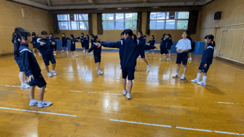 1年生の女子体育では、格技室でダンスの授業を行っています。ダンスリーダーがグループのみんなに振付を教えています。流行りの曲でもあるので、既に知っている生徒もたくさんいるようです。