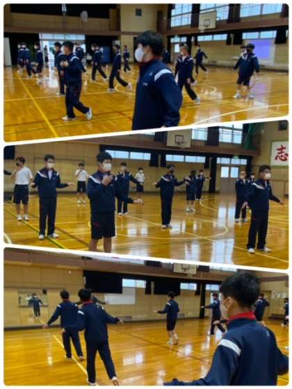 1年生の男子体育の授業では、体育館でダンスの授業を行っています。ダンスにおいては、感じを込めて踊ったりみんなで踊ったりする楽しさや喜びを味わい、ダンスの特性や由来、表現の仕方など、イメージを捉えた表現や踊りで交流することをねらいとしています。