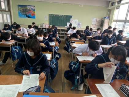 3年生の社会の授業では、他府県の入試問題に取り組んでいます。昨日、公立一般選抜の出願を終え、最後の追い込みです。「いつやるの?」「今でしょう!」
