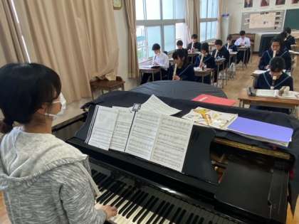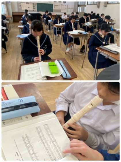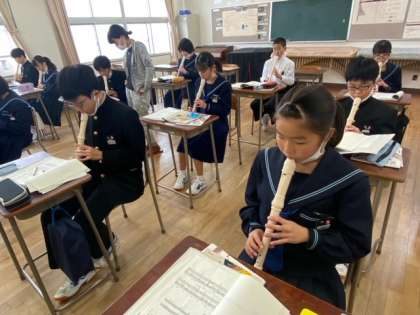 1年生の音楽の授業では、アルトリコーダーで「ハナミズキ」の演奏を学習しています。音楽活動の楽しさを体験することを通して、音楽を愛好する心情を育むとともに、音楽に対する感性を豊かにし、音楽に親しんでいく態度を養い、豊かな情操を培うことをねらいとしています。