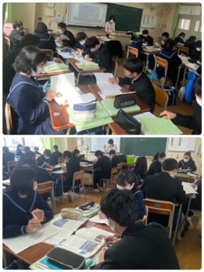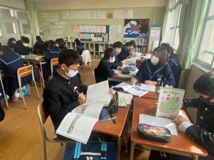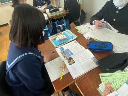 2年生の英語の授業では、グループ学習を行っています。協働的な学習とは、子ども同士が教え合い学び合う学習です。学習課題をグループで相談して明確にとらえるように指導しています。