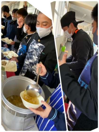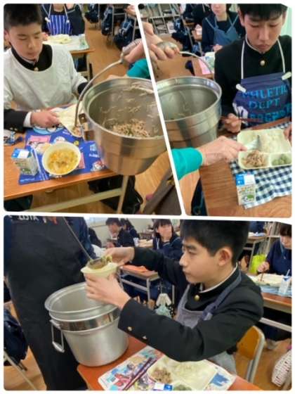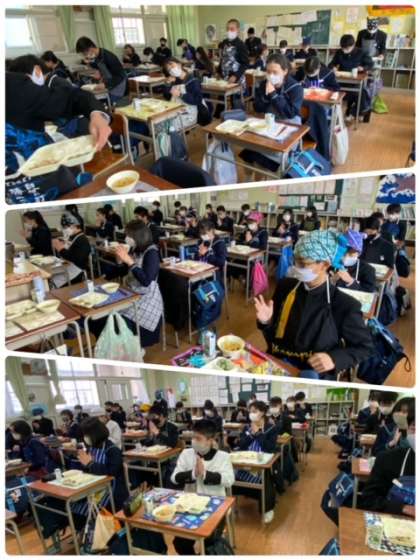 2年生の給食の様子です。今日のメニューは、豚肉と野菜の炒めもの、すまし汁、きな粉よもぎ団子、ご飯、牛乳です。いつもおかわりをたくさんしてくれて、完食です。今日も美味しくいただきました!
