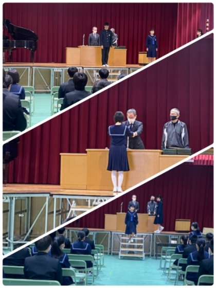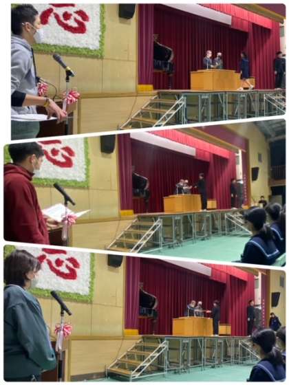卒業証書授与の様子です。担任の先生から名前を呼ばれて、元気よく返事をします。校長先生から証書を受け取ります。