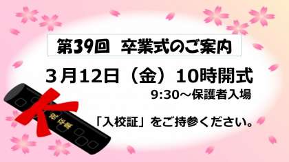 明日の卒業式について、改めてご案内いたします。新型コロナウイルス感染症予防のため、さまざまのことをご理解いただきますようお願いいたします。