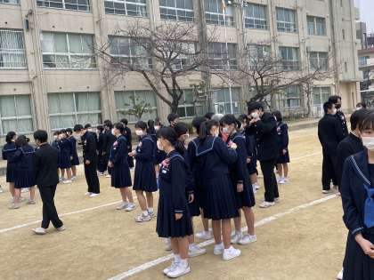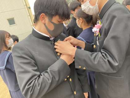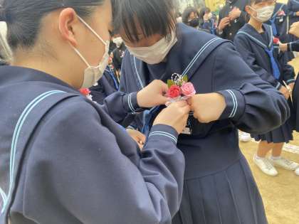 卒業生たちが、PTA寄贈のコサージュを胸につけて入場の準備をしています。
