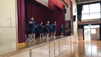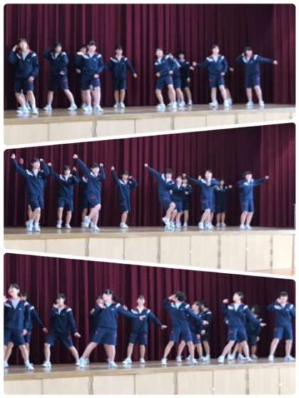 2年生の女子体育では、ダンスの発表会を行っています。Dynamiteの曲に合わせて、グループでアレンジも加えながら楽しくダンシングしています。