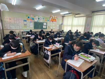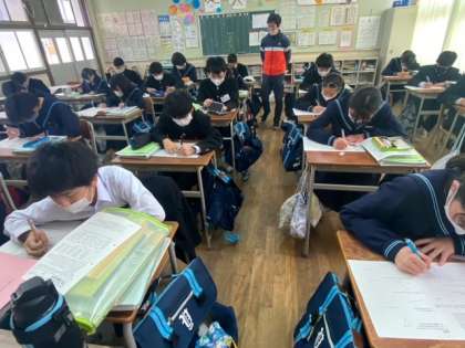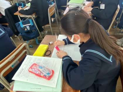 1年生の数学の授業です。数学は、学習内容の積み重ねをするところが多く、1年生で学習した内容をしっかり理解しておくことが、とても大切です。今日の学びは今日のうちに定着できるとよいですね。