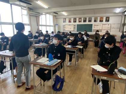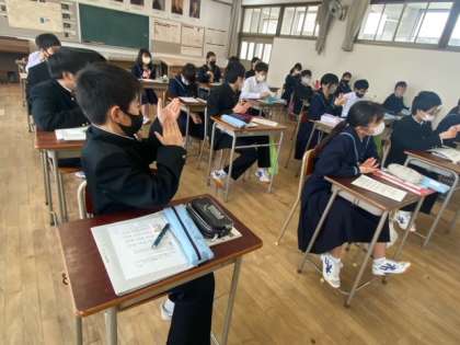 1年生の音楽の授業です。音感を感じるように、ピアノの音を聞いて音階をあてる学習をしています。全問正解の生徒もいて、よく音色を感じることができているようです。