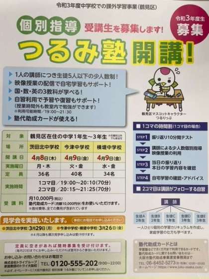 鶴見区役所では、つるみ塾の受講生募集を行っています。対象者は鶴見区在住の中学生(1〜3年生)です。詳細については、配付チラシ及び鶴見区ホームページをご覧ください。