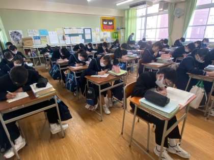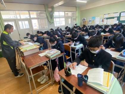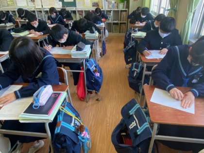 2年生の数学の習熟度授業です。応用コースの生徒たちは、確率の難問に挑戦しています。樹形図から組み合わせをつくり、合計点が何通りあるかを解いています。一つ一つ地道に書いて計算していますが、もっと要領よくできるやり方を考えています。