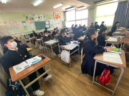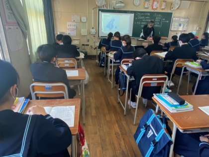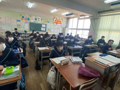 1年生の社会の授業です。今日は小学校の卒業式のため、午前中で下校します。4限目の生徒たちもしっかり学習をしています。