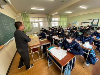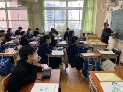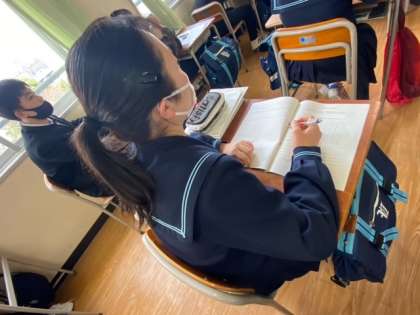 2年生の数学の授業です。教科書からさらに、先生が作成した教材プリントで学習しています。素因数分解から約数や倍数が見つけ出すことができることについての学びです。