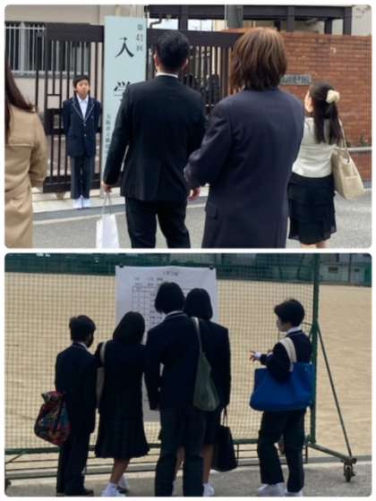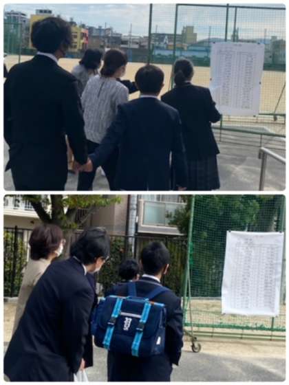 新入生たちが真新しい標準服で、元気に登校してきました。9時からクラス発表の掲示を見ています。ようこそ!横堤中学校へ!