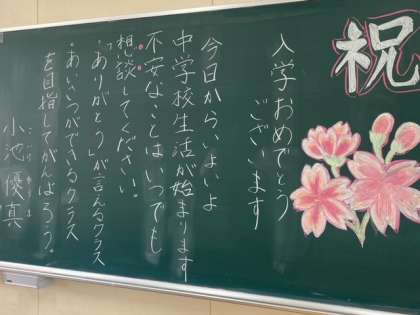 黒板には、先生からのメッセージが描かれています。いよいよ始まる中学校生活です。心も新たに目標を立ててがんばりましょう!
