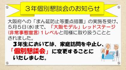 新型コロナウイルス感染症拡大防止として今般の状況を鑑み、3年生は家庭訪問を中止して、「個別懇談会」を行うことといたしました。