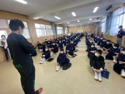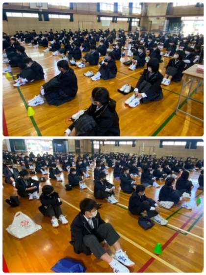 各学年の集会の様子です。1年生は体育館で行っています。担当の先生から、自己紹介をして学校生活全般についてのお話をしています。