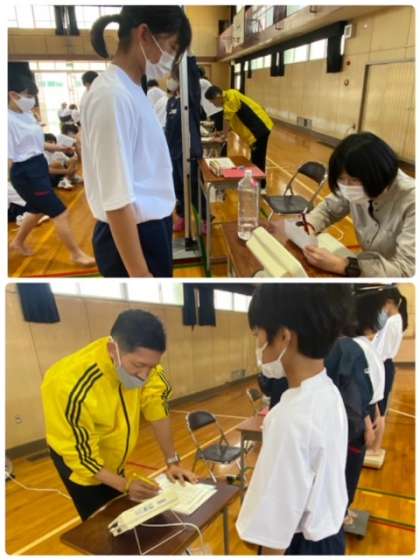 1年生の身体計測の様子です。身長・体重・視力を測り、中学校3年間で大きく成長することを楽しみにしています。