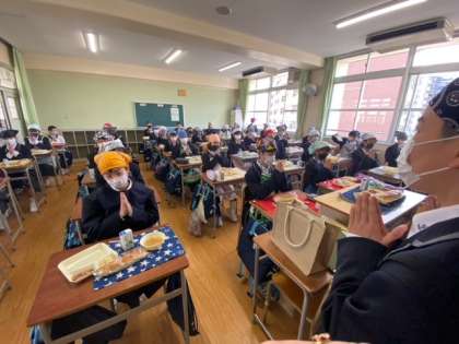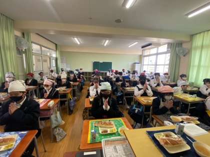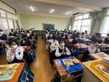 中学校で初めての給食です。給食当番さんが配食・配膳を行ってくれて、「いただきます」をしました。みんなで美味しくいただきます!