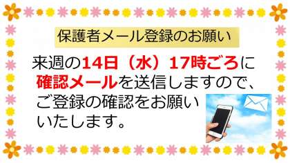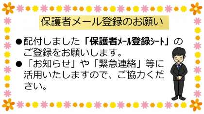 本日、「保護者メール登録シート」を配付いたしました。昨年度の保護者メールは、有効期限が3月31日に切れておりますので、改めてメール登録をお願いいたします。