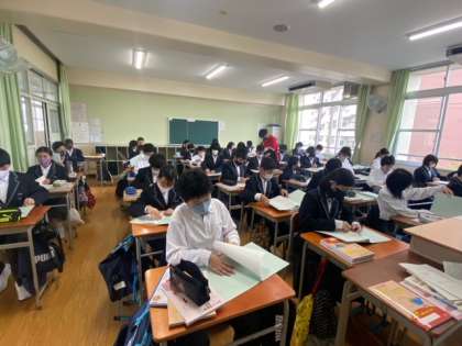 1年生の数学の授業です。授業で使用するファイルを配付しています。各教科で準備するものとして、教科書・ノート・ワーク・ファイル等があります。明日の持ち物は、前日に確認するようにしましょう。