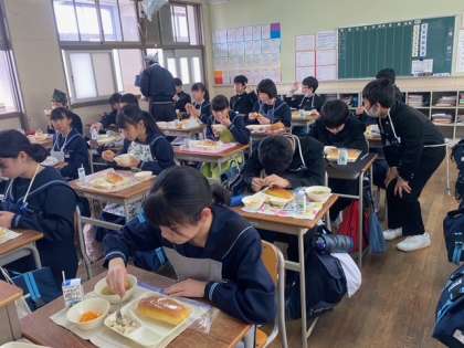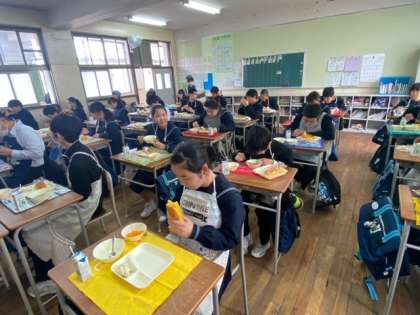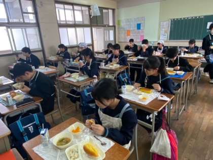 午前中の授業で消費したカロリーを、学校給食で補給していきます。午後からの授業も頑張れ!