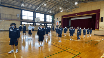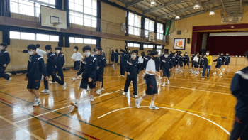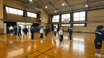 2年生の保健体育の授業です。男女共修で集団行動を学習しています。「右向け右、左向け左、回れ右」指示を聞いて、行動できています。