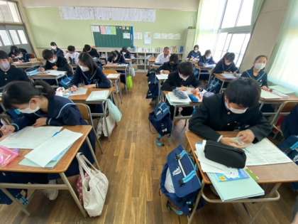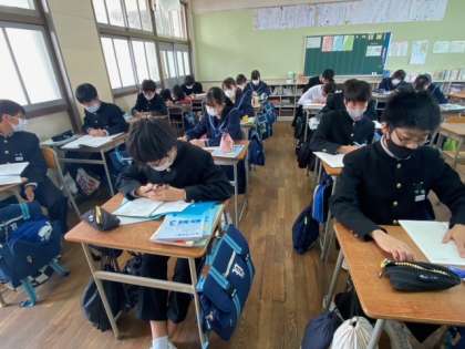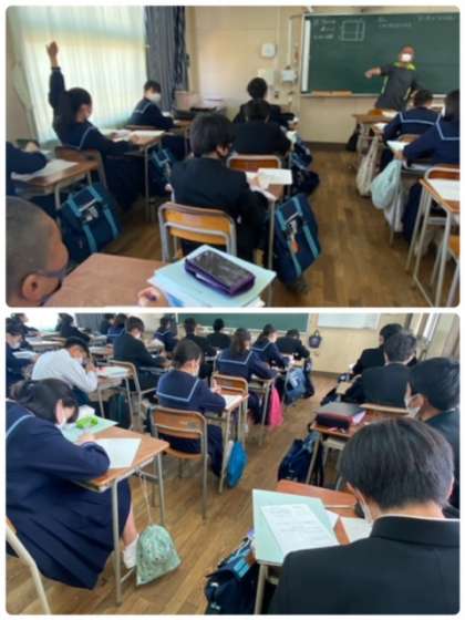 3年生の数学の授業です。課題に対して、積極的に手を挙げて回答する生徒たちが見られます。