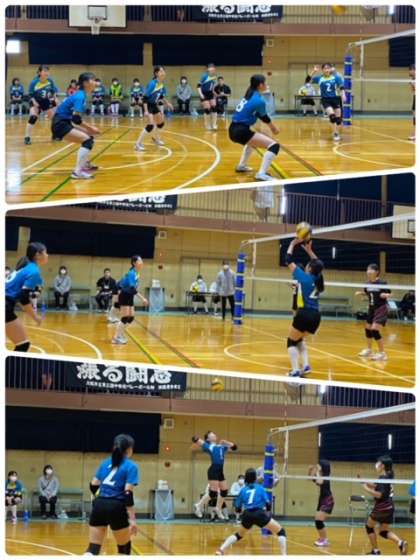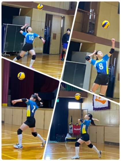 本日、バレーボール部が本校で春季総合体育大会2回戦を行っています。玉出中と対戦しています。昨日の試合のいい流れを継続しており、スパイクが決まっています。