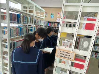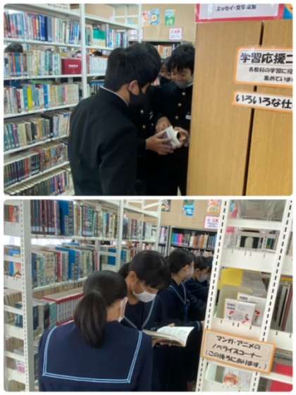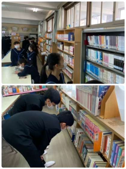 2年生の1時間目は、朝の読書の取組み準備を行っています。図書室で好きな本を選んでいます。