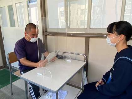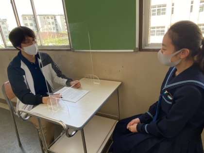 3年生の1限目は、教育相談を行っています。新学期が始まり、気持ちも新たに意気込みんでいるところに、今般の状況で不安や心配事がないかを聞いています。