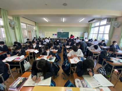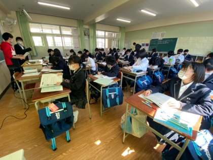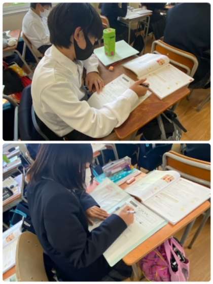 1年生の数学の授業です。教科書、ノート、ファイルを整えて進めていきます。各教科の持ち物がたくさんありますが、毎回の授業をしっかり受けています。