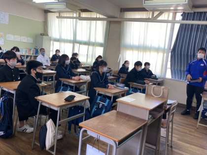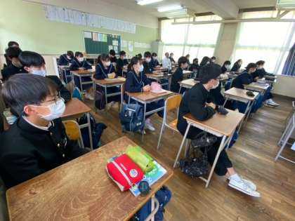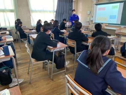 3年生の技術の授業です。先生が作成した教材を提示しながら、説明しています。授業の進め方や技術科のものの見方について、学習しています。