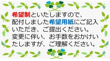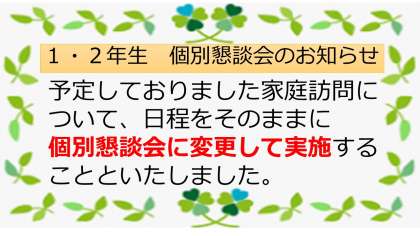 今般の状況により、予定しておりました1・2年生の家庭訪問を「個別懇談会」に変更して実施いたします。昨日、お知らせプリントを配付しましたので、詳細についてはご覧ください。