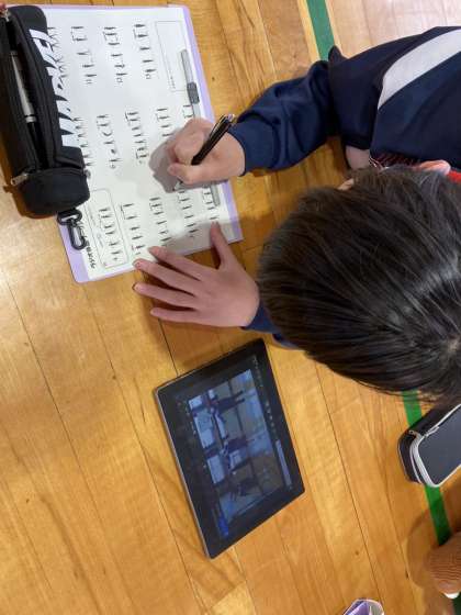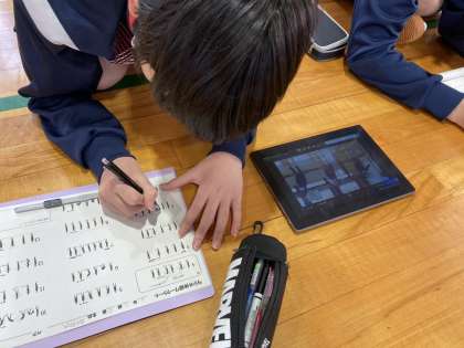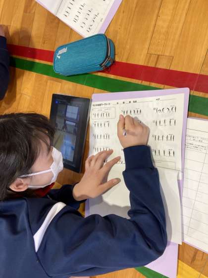 撮影した動画を見て、振り返りプリントに記入しています。自分の動きを実際見てみると、動きの正確性がよくわかるようです。