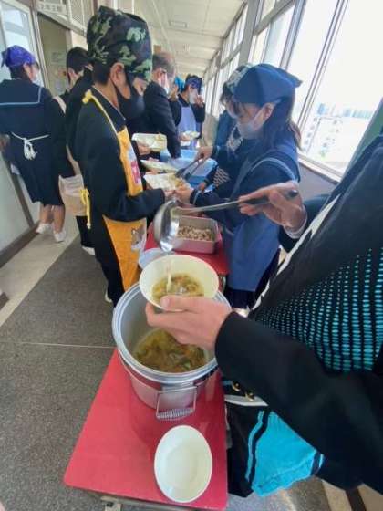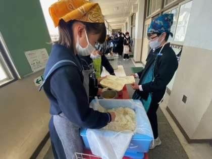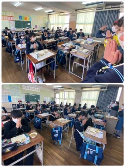 今日の給食メニューは、鶏のから揚げ、中華スープ、チンゲン菜ともやしの甘酢和え、ごはん、牛乳です。2年生の給食当番が配膳しているところと「いただきます」のあいさつです。今日も美味しくいただきました!