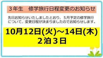 過日、今般の状況により修学旅行の延期についてお知らせいたしました。つきましては、目的地を変更せず、日程調整を行いましたところ、変更日が決定しましたのでお知らせいたします。詳細については、配付プリントをご覧ください。