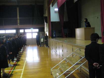 続いて、教育長表彰を受けた3年・長澤未波さんへの賞状伝達をし、中山先生から「当たり前と思っていることへの感謝の気持ち」についての講話、浜口先生から生活指導についてこの1年間のまとめの話をしました。