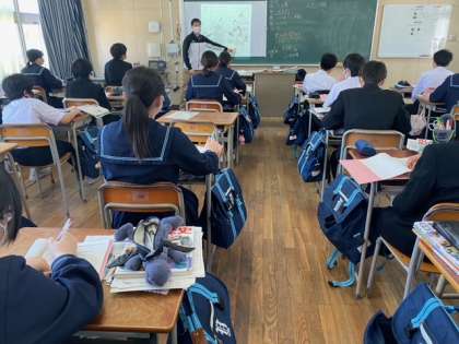 3年生の社会の授業では、歴史的分野の学習を行っています。明治時代の文化について、教科書のイラストを黒板に投影して説明しています。