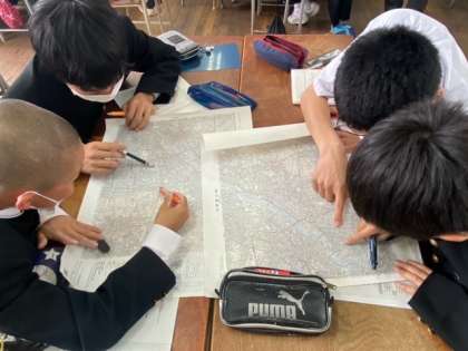 2年生の社会の授業では、地図の縮尺について学習しています。5000分の1と25000分の1の地図を用いて、実際の距離を推測して測ります。いろんな方法があるので、班でそれぞれのやり方を考えています。