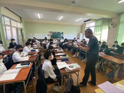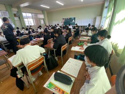 1年生の社会では、コの字型で授業をしています。生徒同士のお互いの顔がよく見えるため、学習内容の確認がよくできます。ワークブックの世界地図を色付けして学習しています。