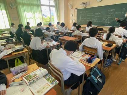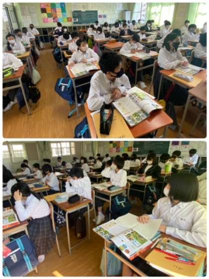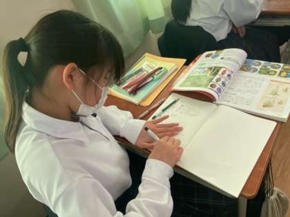 1年生の理科の授業です。学習内容で、種子植物などの図を用います。ノートにも丁寧に書き写してまとめています。