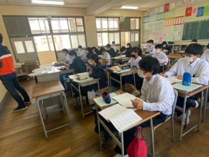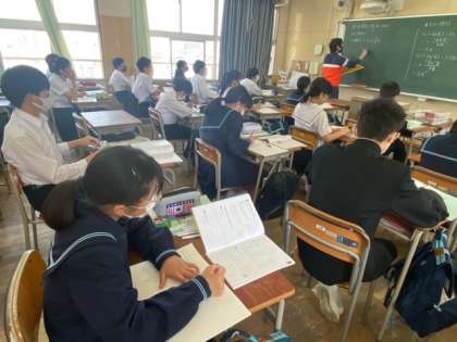 2年生の数学の授業です。計算問題を反復練習して、基礎基本の定着を図っています。