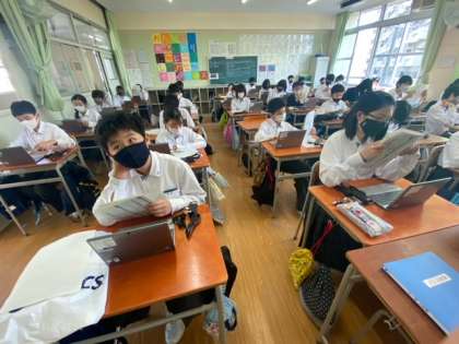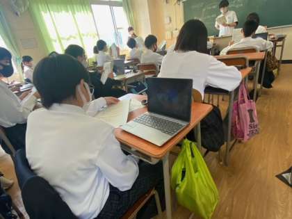 1人1台学習者用端末の使い方を説明して、持ち帰りをしています。端末は貸与しているものですので、丁寧に扱っていただくようお願いいたします。