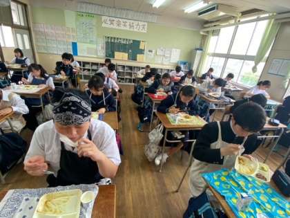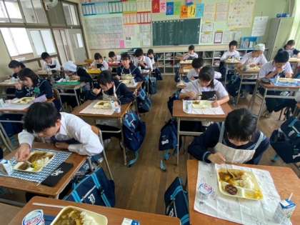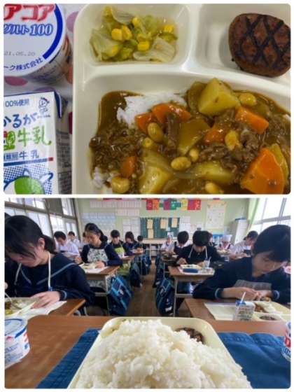 食欲旺盛な生徒たちに負けずとも劣らぬ、山盛りご飯でカレーライスを食しています。午後からの授業をしっかり頑張ろう!