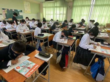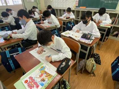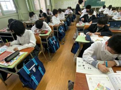 1年生の英語の授業です。覚えるべき英単語がだんだんと増えてきています。英単語は、目で見て耳で聞いて発音していくことで覚えやすくなっていきます。