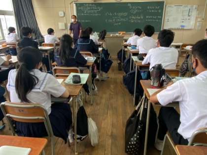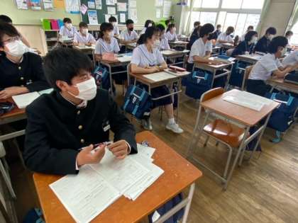 3年生の数学の授業では、因数分解を学習しています。計算に導くためのヒントから、生徒自身が解決できるように工夫しています。